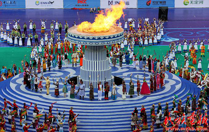 2015年8月9日下午,第十屆全國少數(shù)民族傳統(tǒng)體育運動會在內蒙古鄂爾多斯隆重開幕。56個民族運動員代表共同點燃第十屆全國少數(shù)民族傳統(tǒng)體育運動會的圣火(列來拉杜 攝影)