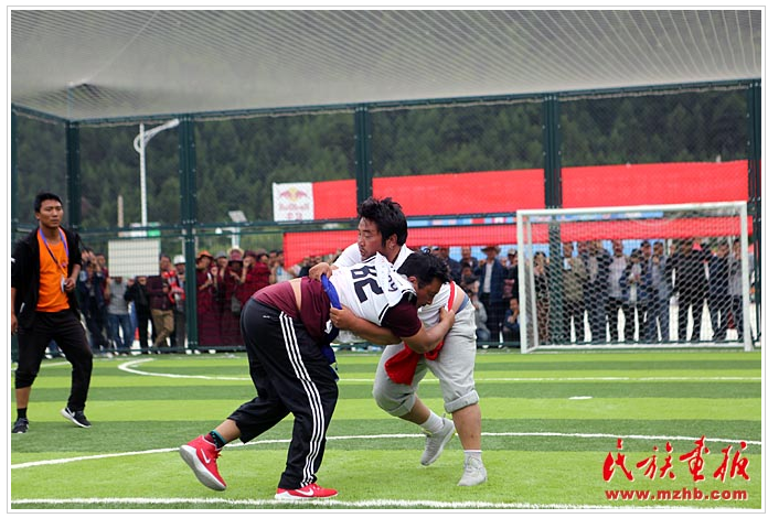 甘肅省甘南藏族自治州的迭部縣安多地區(qū)則巴邀請賽男子摔跤80公斤以上比賽(民族畫報記者 黃若天 攝影)