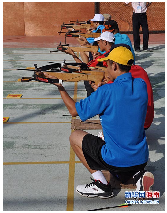 海南省第五屆少數(shù)民族傳統(tǒng)體育運動會比賽項目之一——射弩(新華網(wǎng) 圖)