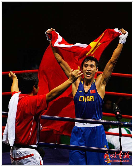 蒙古族拳擊運動員張小平獲北京奧運拳擊比賽金牌(民族畫報資料)