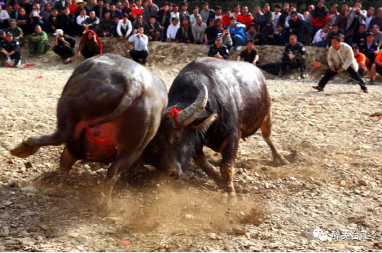 ▲ 斗牛之牛,都是專門精心飼養(yǎng)的,不從事耕地、拉車、推磨等勞作,均為雄性水牛,分為寬角、窄角兩個級別。斗牛賽制,先為淘汰賽,決斗時改為單循環(huán)賽,最后勝出者為年度牛王。斗牛場面十分慘烈,動人心魄,觀眾少則數(shù)百,多則數(shù)萬。