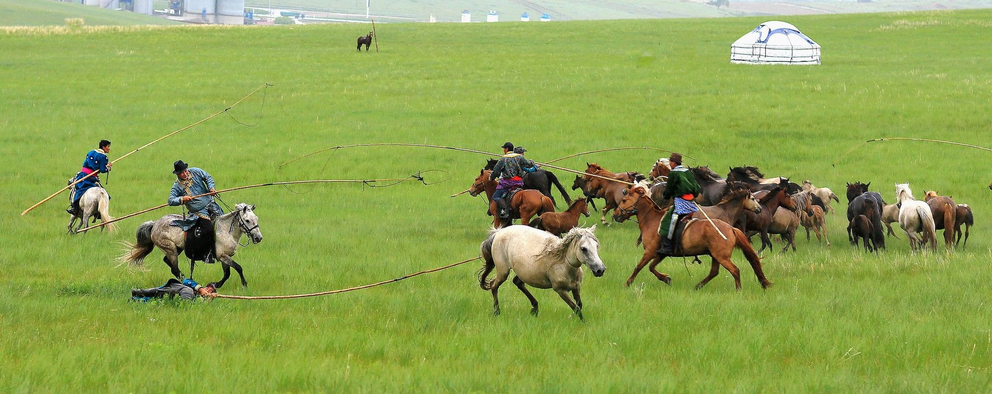 繩索套馬是蒙古族的傳統(tǒng)體育活動。原為牧民放牧?xí)r約束馬匹的一種手段。比賽時,選一烈性難馴的馬,先令其疾馳。參賽的成群騎手,手持打有活結(jié)的繩索,騎馬緊追,到一定距離,拋出繩索套馬,以先套準(zhǔn)并能束住烈馬者為勝。