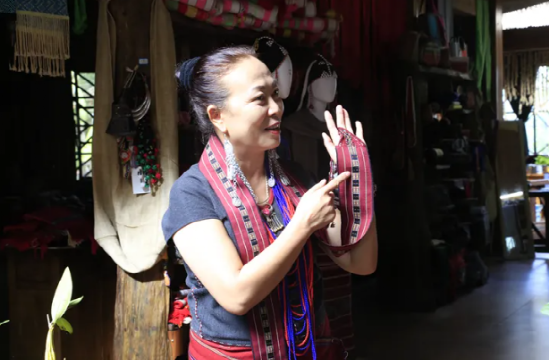 娜紅是勐梭鎮(zhèn)他朗村十組的老婦女主任,十多歲起開(kāi)始學(xué)習(xí)佤族織錦技藝,隨后加入了李憲蘭工作室?!拔铱靠椮翦\為家里織出了兩層樓房。”娜紅感恩佤錦技藝為家里帶來(lái)的改變,從前是白天勞動(dòng),晚上織布,一年只能賣(mài)得2000元?,F(xiàn)在,每個(gè)月可以拿到3000元工資,年底還有分紅,日子越來(lái)越有盼頭。