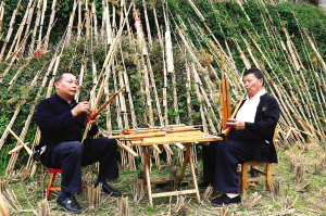 隨著日子的臨近,有些村寨的蘆笙手干脆包米包菜到莫師傅家守候和督促。大量訂戶的到來(lái)使莫師傅的工作室變得擁擠不堪。莫厭學(xué)、莫里學(xué)兩兄弟干脆把制作蘆笙的工作室搬到室外,把最近2個(gè)月來(lái)制作的1077把蘆笙也搬到室外逐一進(jìn)行檢修和校音。