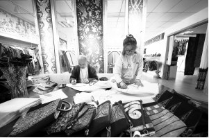 圖為蠟染非遺工坊的設(shè)計(jì)師們正在設(shè)計(jì)蠟染產(chǎn)品。