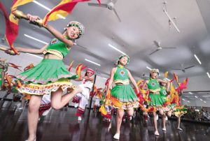 “同學們,耍起來的時候一定要把手臂擺起來?!痹诙魇┦邪沤抖弊遴l(xiāng)民族初級中學,老師正在給學生們傳授表演非物質文化遺產板凳龍的技巧。為傳承中華優(yōu)秀傳統(tǒng)文化,學校開設了特色課程?!靶埴椪钩帷薄把┨焐w頂”“黃龍纏腰”“猛虎下山”……老師教得耐心細致,學生舞得有模有樣。