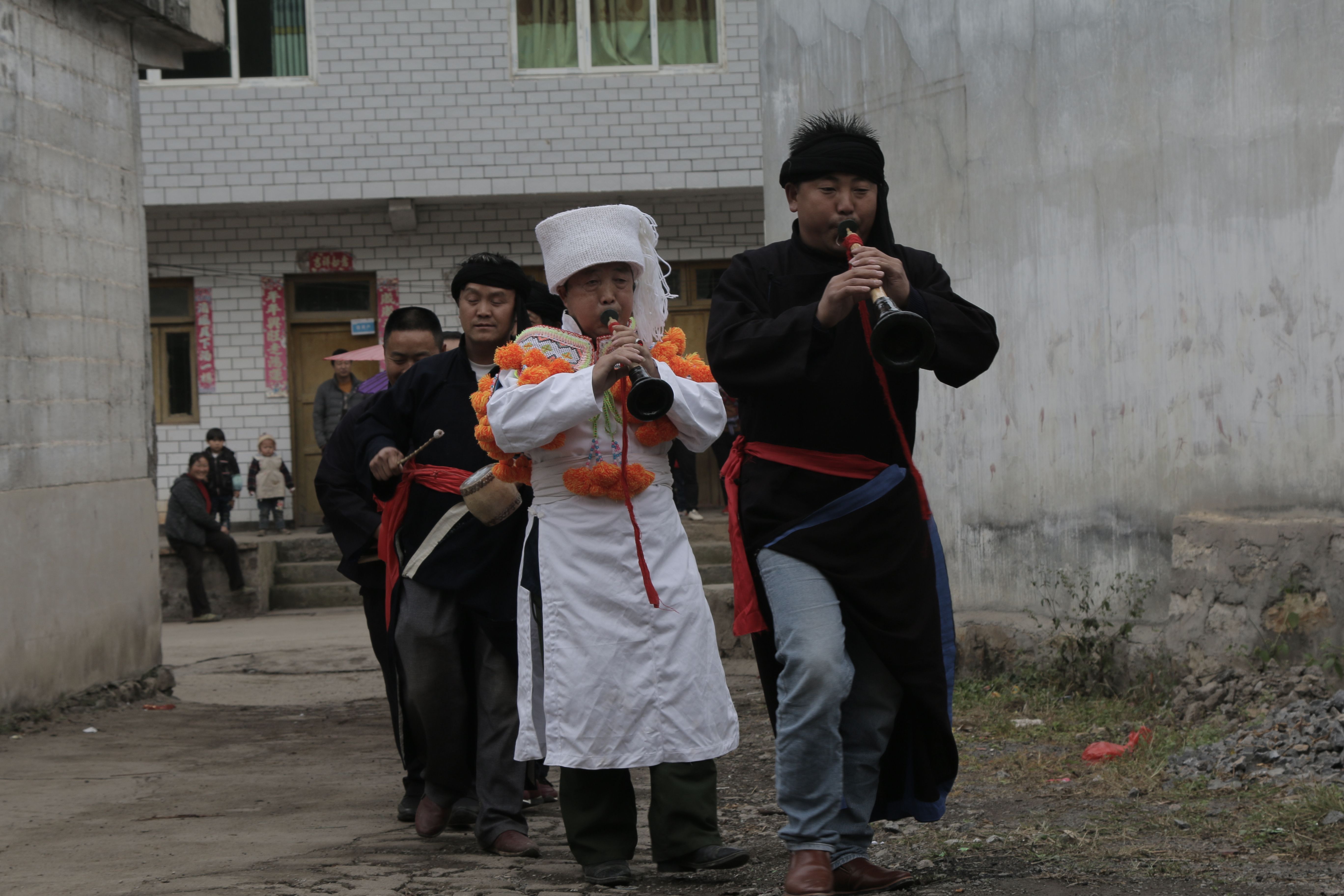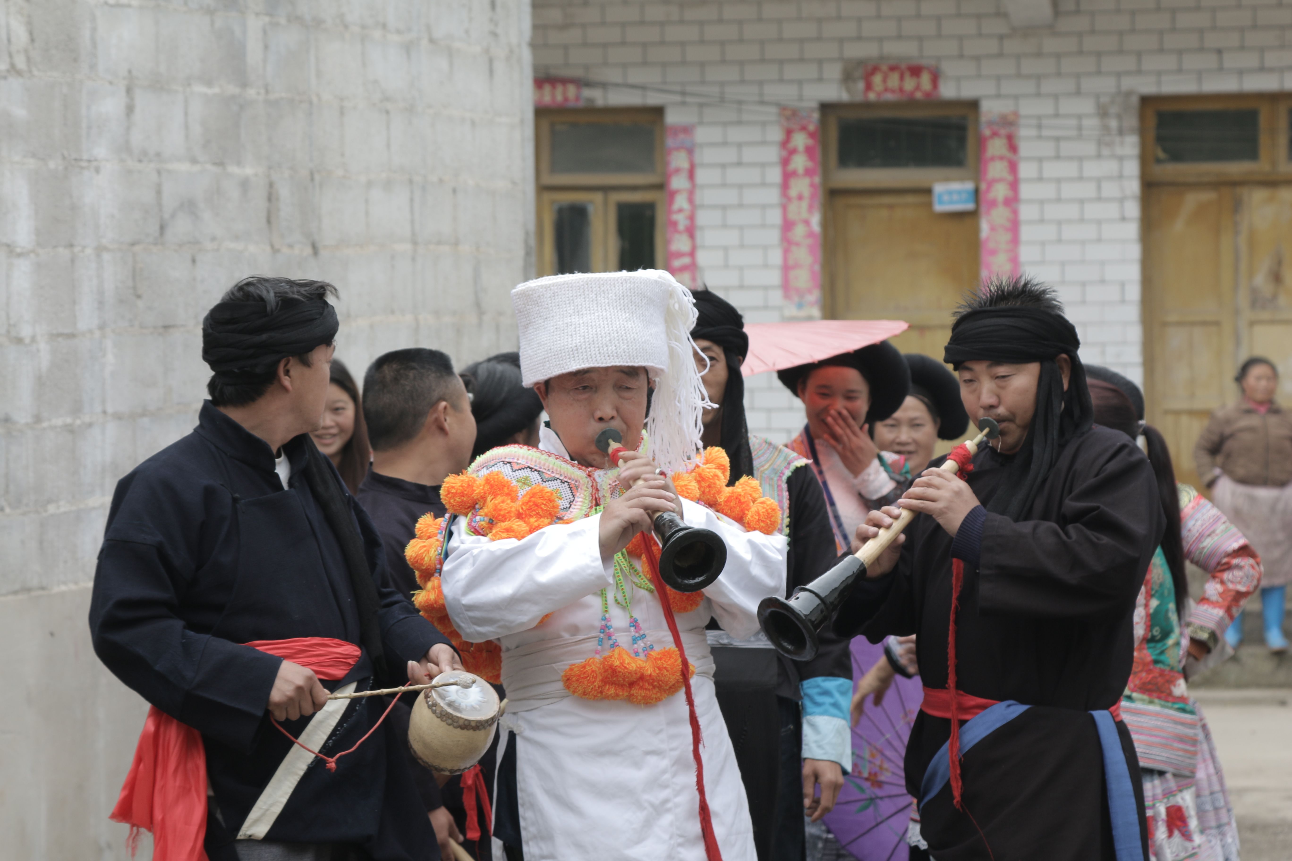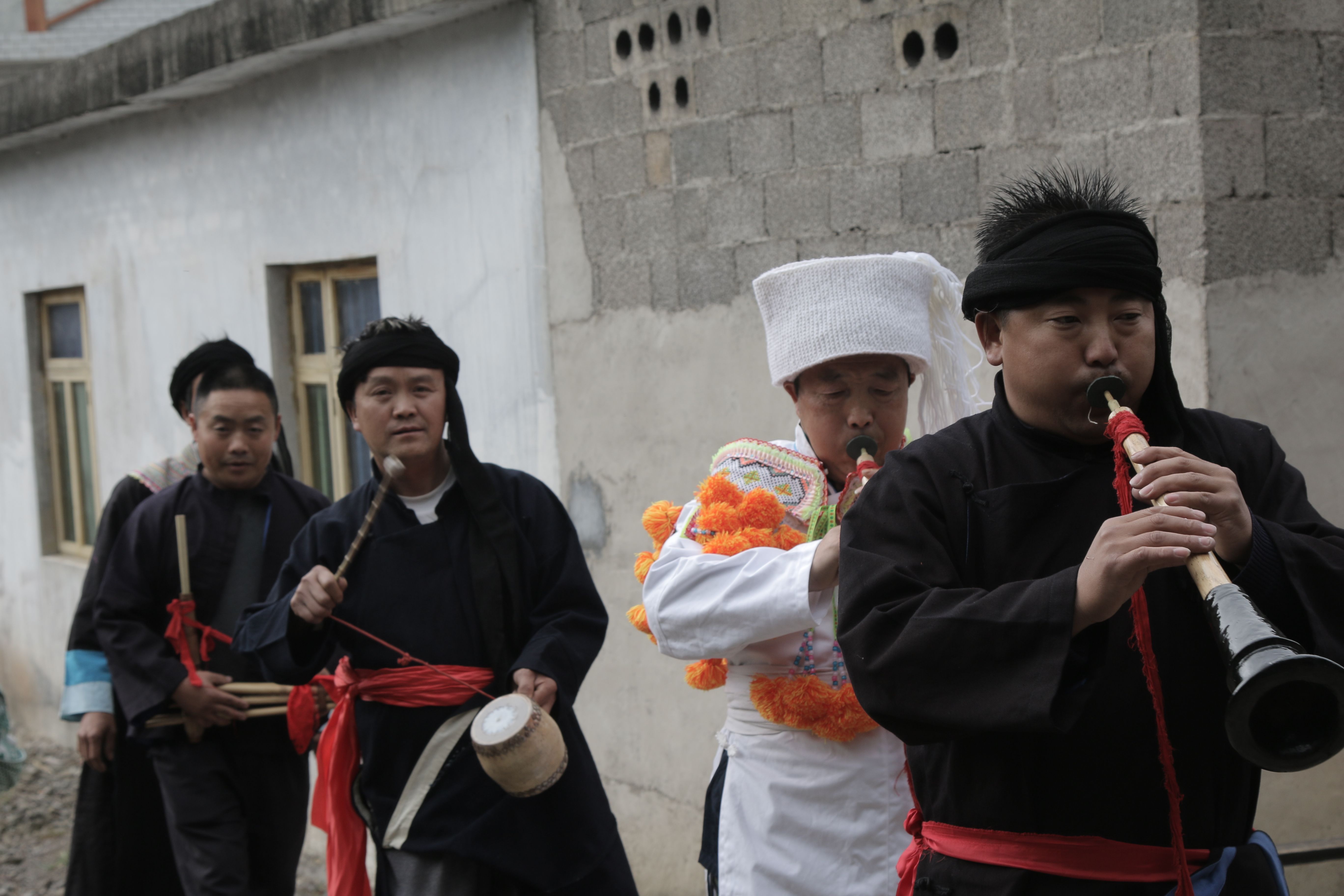 圖片說(shuō)明:貴州貴陽(yáng)苗族婚禮上的奏樂(lè)